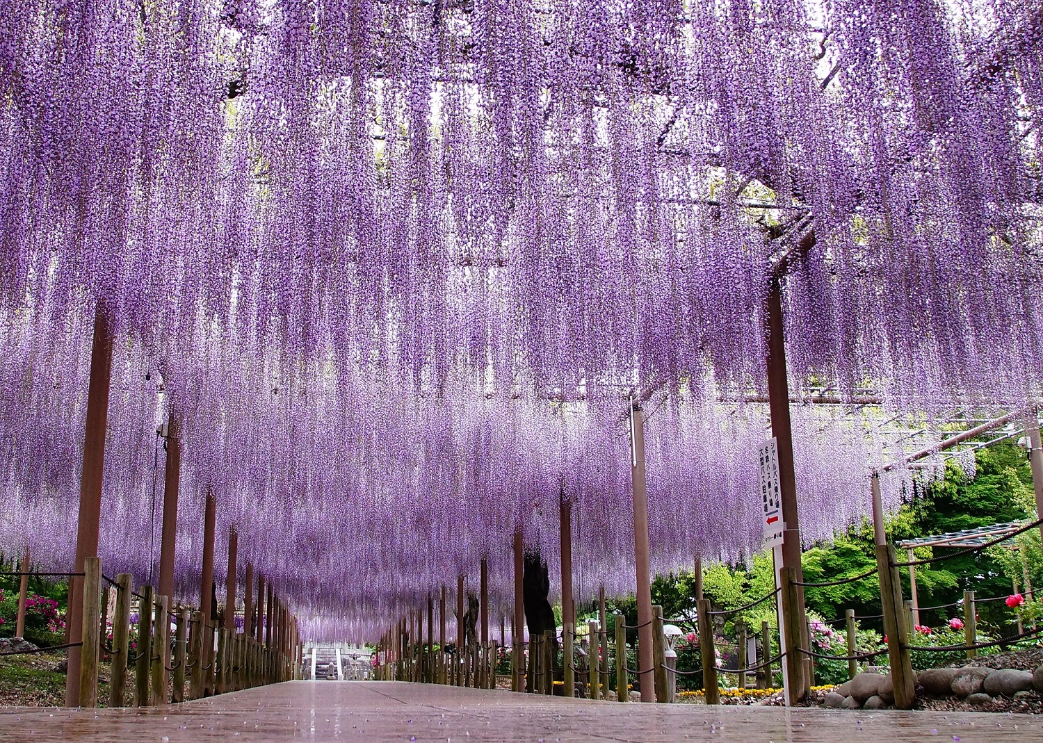 昼は華やかに、そして午後6時30分から9時までは藤棚のライトアップも行われ、幻想的な雰囲気へと表情を変えます。春の夜に光り輝く藤の花は訪れる人々を魅了します。